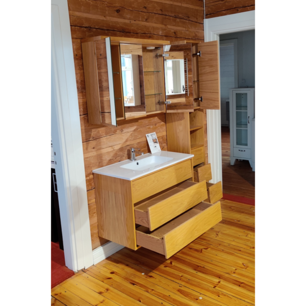 Ainutlaatuinen tammivanerista valmistettu kalusteryhmä sisältää allaskalusteen posliinialtaalla ja kolmella push-open laatikolla, Hafa Mix pesuallashanan, Hafa pop-up pohjaventtiilin, peilikaapin LED-profiililla sekä korkean kaapin. Peilikaapissa molemminpuoliset peiliovet joissa alareunassa massiivipuinen vedinlista, lasihyllyt sekä pistorasia. Korkean kaapin ovi on pehmeästi sulkeutuva, sen alla siirrettävä lasihylly ja alaosan kolme laatikkoa toimivat myös push-open mekanismilla.