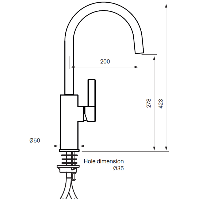 Tapwell ARM180 Honey Gold keittiöhanan myymälämalli, ilman pesukoneventtiiliä. Juoksuputken kääntösäde voidaan rajoittaa 60° – 270° välillä, 30° välein. Hanan asennusreikä Ø 40 mm.
