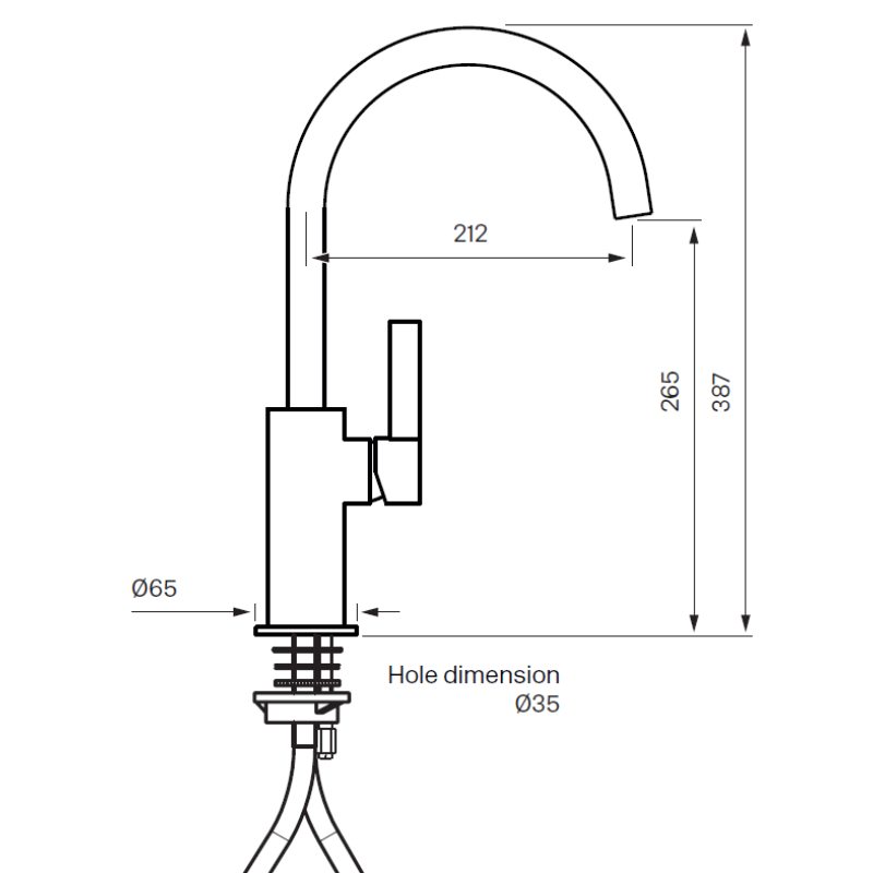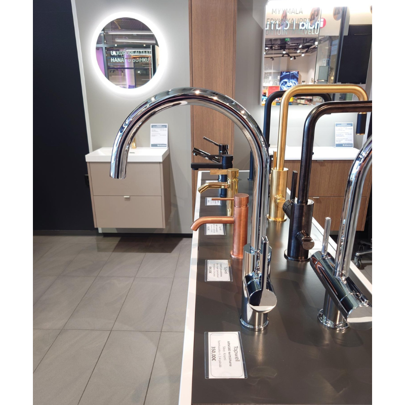 Tapwell ARM380 keittiöhanan myymälämalli, ilman pesukoneventtiiliä. Matalampi malli ARM180 hanasta. Juoksuputken kääntösäde voidaan rajoittaa 60° – 270° välillä, 30° välein. Hanan asennusreikä Ø 40 mm.